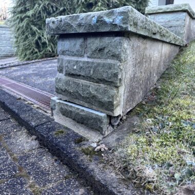 Am Abend des 25.12. oder in der Früh am 26.12 muss ein blaues Fahrzeug die Gartenmauer gerammt haben, sodass diese gebrochen und verschoben wurde. Die Mauer ist von der Straße ca. 50 cm Hoch