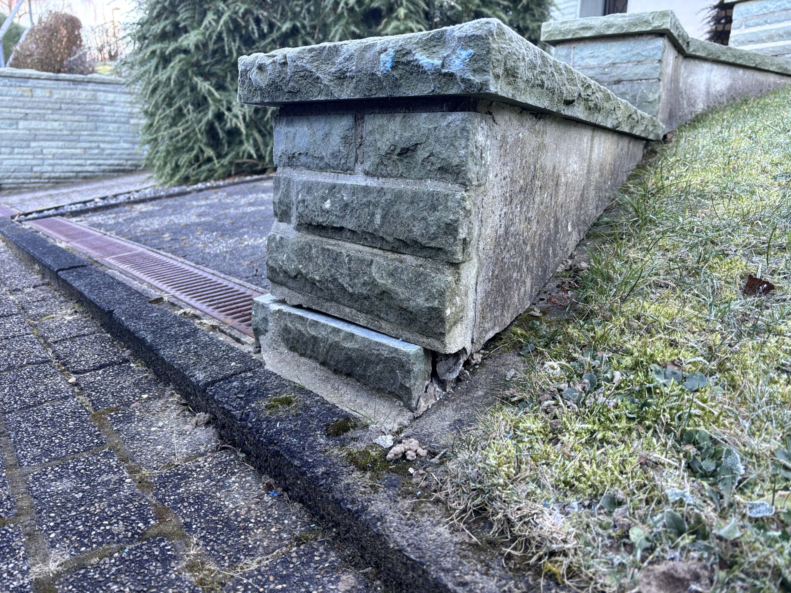 Am Abend des 25.12. oder in der Früh am 26.12 muss ein blaues Fahrzeug die Gartenmauer gerammt haben, sodass diese gebrochen und verschoben wurde. Die Mauer ist von der Straße ca. 50 cm Hoch